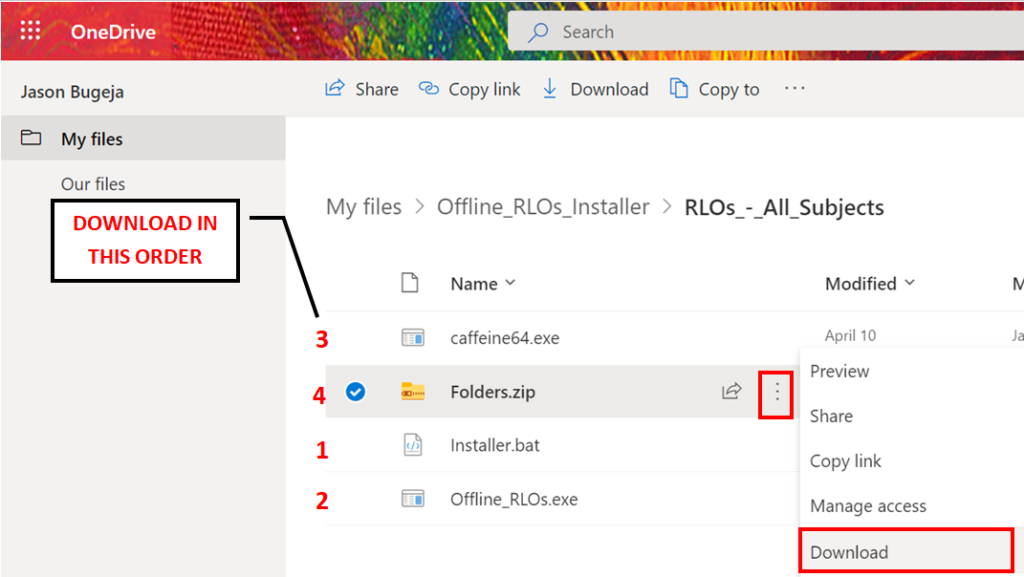 - Download the files individually on your device; start by clicking … next to installer.bat and click Download. Do the same for Offline_RLOs.exe followed by, caffeine64.exe and finally Folders.zip. Always wait for each file to download completely before downloading the next file and leave Folders.zip for last. The download process will take roughly 60 minutes depending on your connection. By default the files will be downloaded to the Downloads folder or a location that you choose, it is important that you download the four files to the same location. Disk space required is 36.6GB.